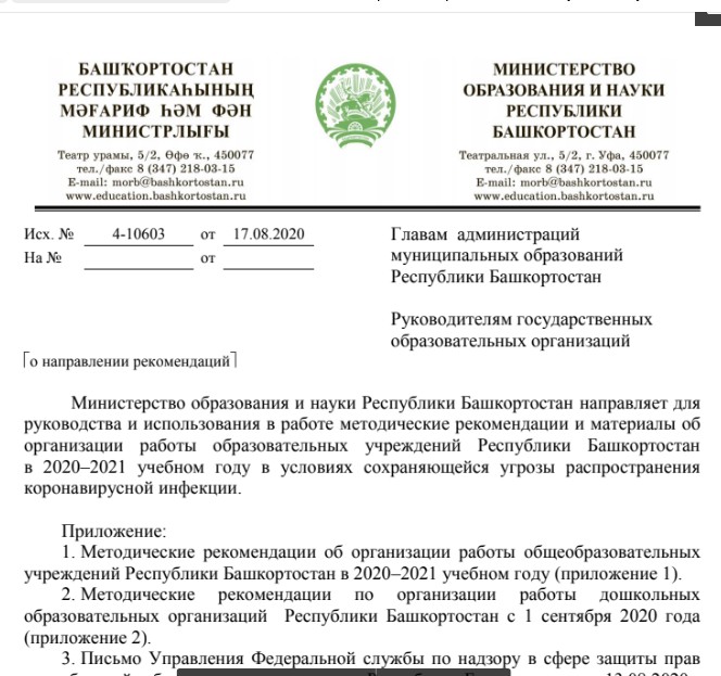 Письмо Министерства образования и науки Республики Башкортостан от 17.08.2020 №4-10603 о методических рекомендациях и материалах об организации работы образовательных учреждений Республики Башкортостан в 2020–2021 учебном году в условиях сохраняющейся угр