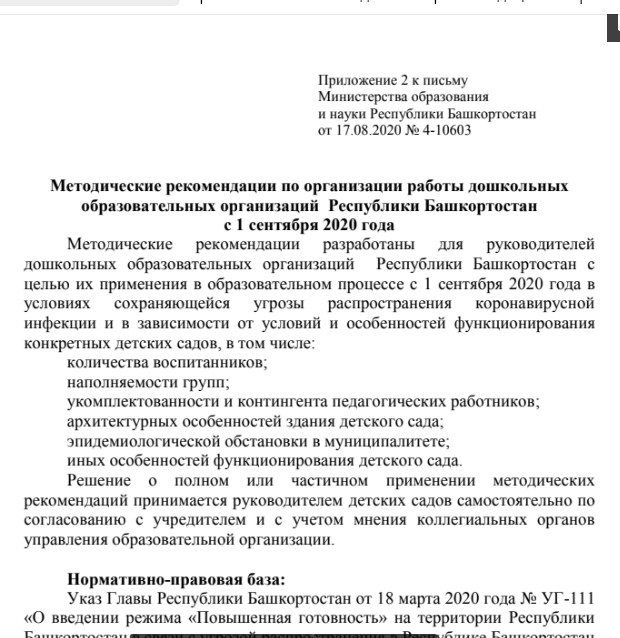 Приложение №2. Методические рекомендации по организации работы дошкольных образовательных организаций Республики Башкортостан с 1 сентября 2020 года